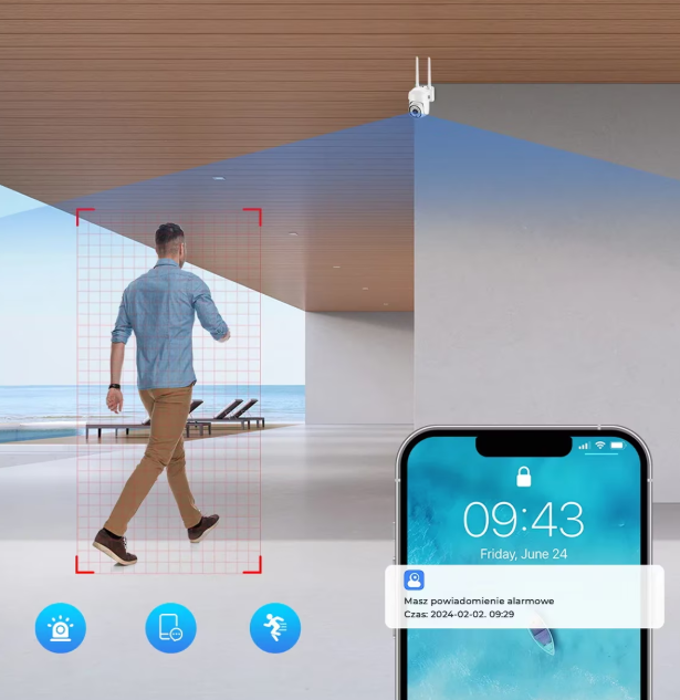 Din aplicatie puteti stabili zona de alerta, cand va fi detectata miscare in acea zona, camera va emite alerte sonore si mesaje de alerta. De exemplu puteti stabili zona portii de intrare, o zona vulnerabila, chiar daca camera filmeaza pe o zona mai larga.
